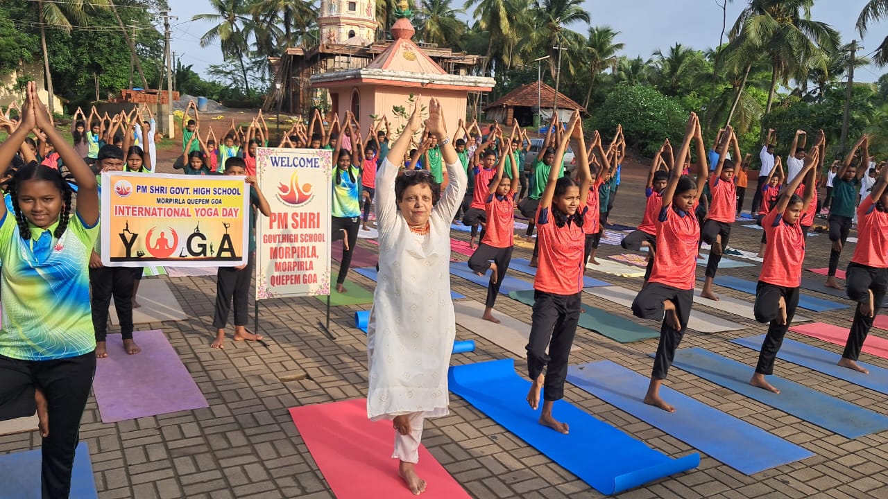 International Yoga day was celebrated by the students, teachers, parents at PM Shri GHS Morpirla with great enthusiasm. The function began with a prayer and all watched address by Honourable PM Modi on the Occasion. Headmistress Maria Murena Miranda spoke highlighted the theme Yoga for one Health ,one Earth and the connection between individual well being and environmental harmony. It fosters physical and mental wellness and contribute to a unified global movement. She urged all to strengthen the mind body connection and promote a healthier planet together.